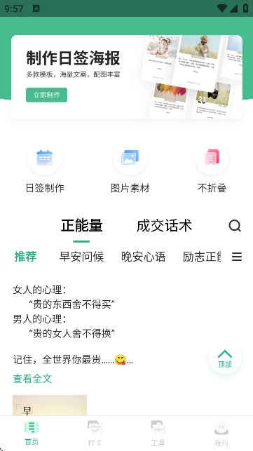 早安语录是一款融合了正能量文案推荐、日常心情表达与高清美图打卡功能的知性文字应用,每日一句励志又暖心的早安文案,助你开启元气满满的一天。