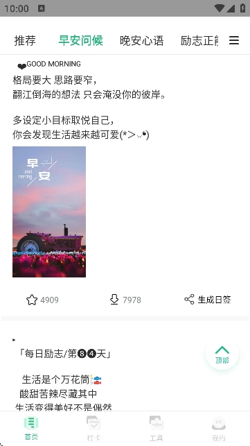 早安语录是一款面向文字爱好者、文案从业者与社交媒体用户的每日励志心语应用。它包含早安心语、晚安心语、励志语录、情感句子、节日祝福、唯美台词等丰富主题分类,配有精美图片,支持生成打卡卡片并一键分享至朋友圈或社交平台。每日更新大量优质金句,助力用户轻松获取灵感、表达心情、增强文字感染力,是提升朋友圈人气、激励自我成长的实用工具。