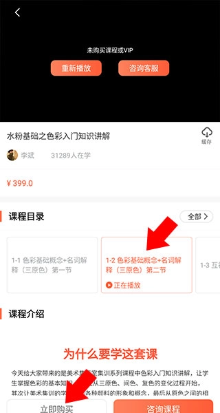 4、确认无误后,点击第二节课进入付费页面,再点击“立即购买”按钮完成支付操作。