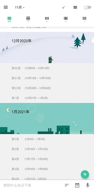 -提供日、三日、周、月视图,采用上下滑动的时间轴设计,与Google日历的样式相似。