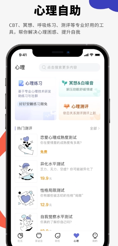 我们提供借助CBT(认知行为疗法)、冥想、心理测评等科学手段开发的自助练习工具,助力用户调节情绪状态、增强自尊水平、缓解焦虑情绪、优化依恋模式等。