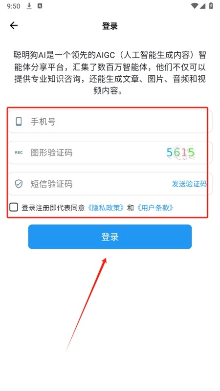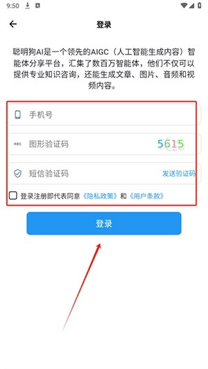 2、进入注册界面后,填写账号与收到的验证码,勾选同意服务协议和隐私政策,点击“登录”按钮就能完成账号注册并自动登录,不需要重复操作。