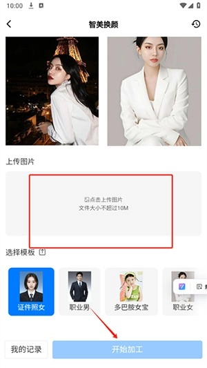 5、以“智美换颜”功能为例,上传图片后,挑选合适的模板,再点击“开始加工”按钮,就能快速生成具有个性化特点的效果。