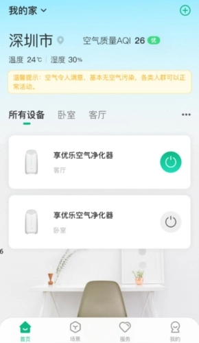 1、在享优乐中通过一键连接或雷达添加净化器设备后,您就能远程操控机器的开关、风速、定时等功能。