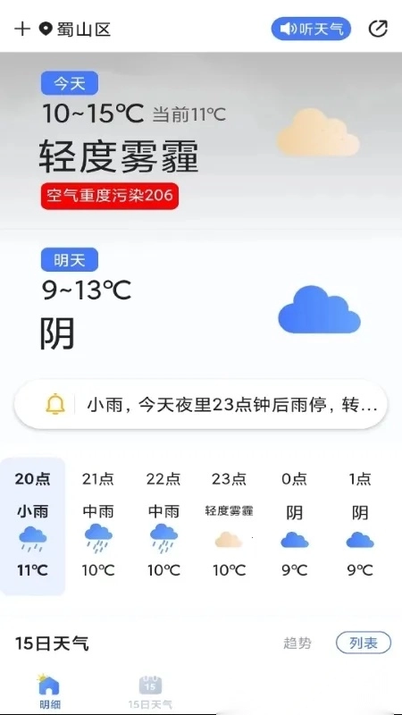 你是否想了解灵石未来15天的天气状况?这款天气预报工具可以帮你实现!它能提供准确的15天天气预报,涵盖风向、温度、空气质量等内容。无论是外出旅行,还是日常活动安排,都能提前了解天气变化,做好相应准备。