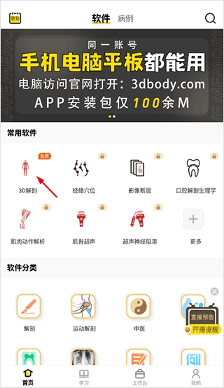用户打开3DBody解剖学软件后,能在系统的各个分类板块里查找并获取所需的资料内容。