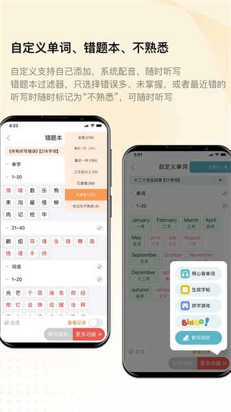 一、中英文同步听写:覆盖小学至中学语文与英语词汇,支持自定义生字词、单词导入,实时更新教材内容,适配46种以上主流教材。