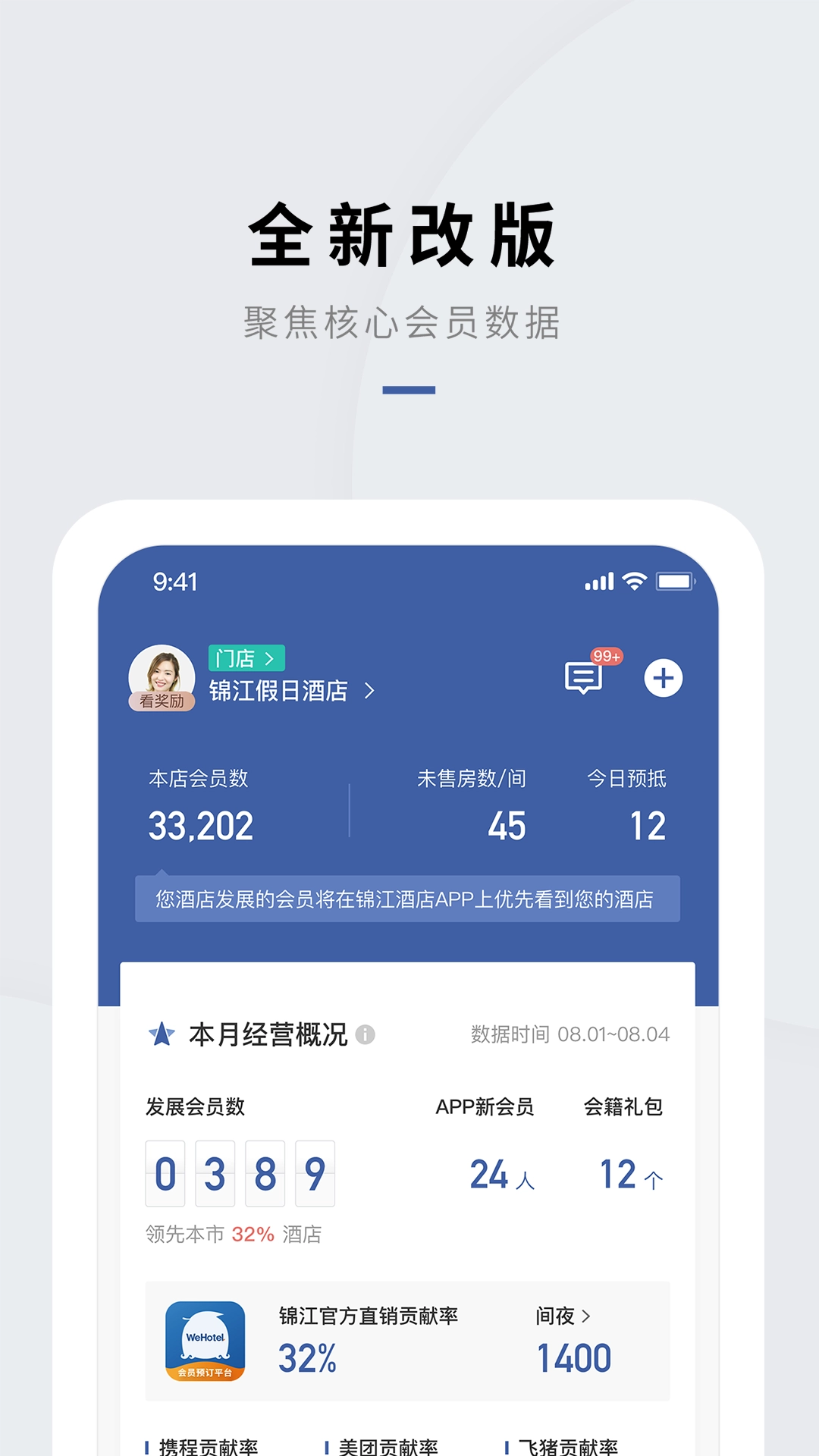 WeHotel会员通是锦江WeHotel推出的一款聚焦会员经营的酒店运营管理移动应用产品,借助大数据与智能分析挖掘技术,打通酒店业务闭环,以会员经营为核心,融合先进营销理念,提升酒店营销效能,为酒店经营管理提供有力支持。