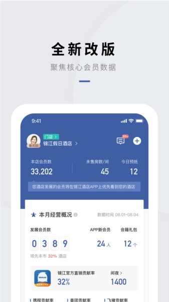 酒店管理层能借助会员通实时掌握酒店运营数据,像会员数量、订单量、业绩等情况;销售员可以查看个人销售业绩及排名,以此激发销售热情。会员则能够享受一站式预订服务,涵盖酒店预订、在线商城等内容。