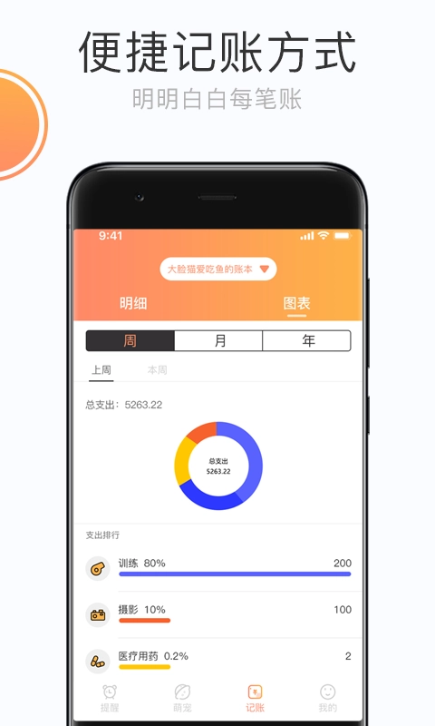 2、用户可对宠物的日常支出进行记录与管理,账单一目了然,能轻松了解日常花费的变化情况。