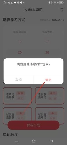 当弹出确认窗口时,点击【确认】按钮即可成功删除已选中的背词计划。