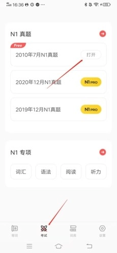 1、打开MOJiTest,点击底部导航栏里的【考试】选项,挑选你想要参与的考试类型或者练习内容;