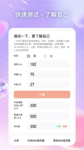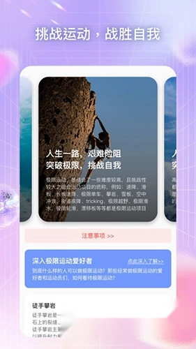 除了打卡功能外,这款软件还提供了各类运动的专业教程和丰富的知识科普内容。无论是想学习正确跑步姿势、呼吸方法的新手跑者,还是希望掌握专业健身训练技巧、肌肉锻炼原理的健身达人,都能在这里找到详细实用的教程指导。此外,软件的运动计算功能也很强大,用户只需输入身高、体重、年龄、性别等身体数据,它就能通过科学的运动算法自动匹配合适的运动项目,并为用户制定合理的运动强度和时间建议,确保用户在健康科学的运动规律下锻炼,帮助用户养成良好的运动习惯,保持身心健康,享受运动带来的快乐与益处,成为用户运动健身路上的得力伙伴。