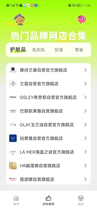 4、在好物推荐页面里,能够了解到各类护肤品、洗衣机、空调以及零食的网店相关信息。