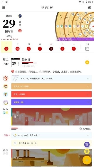 2、除了基础的日期信息外,甲子日历还会展示当日的天气情况、气温、风力等内容。