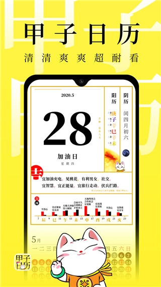 用户打开甲子日历进入后,在日历页面就能看到当日的日期信息,还能看到农历日期、今日宜忌等内容。