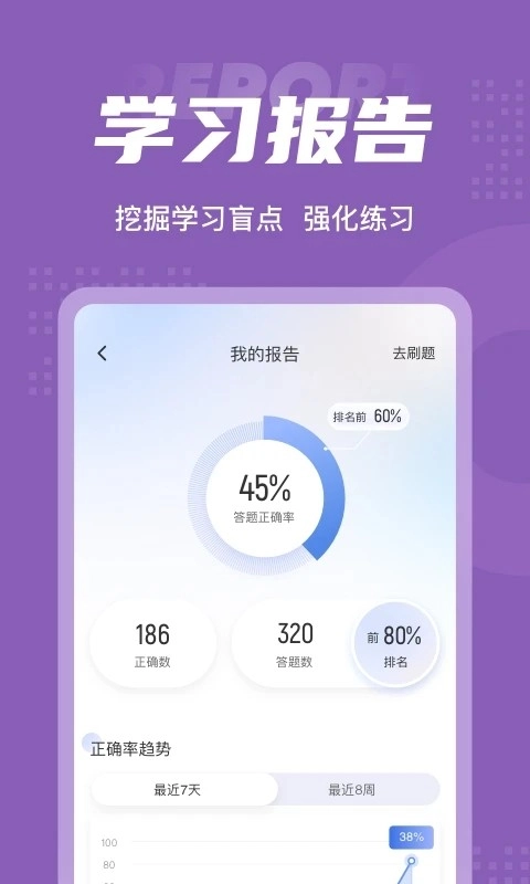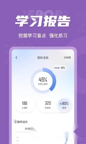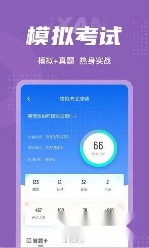 【多元化刷题模式】涵盖考点专项练习、全国通用卷与地区卷模拟训练,还有按考试固定分值比例随机抽题的真题考场;成绩单实时追踪考试数据,全方位反馈考生近期学习状态及正确率提升情况,有效增强考生通过考试的信心
