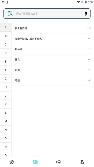 3、点击软件底部的书本图标,就能打开词典,用户可以根据首字母快速搜索、查询文字词汇。