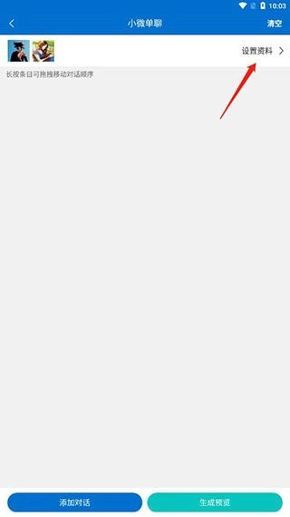5、在对话生成器截图神器的使用中,对话截图是最常用的功能,操作方法十分简单:点击“小微单聊”后,会看到两个微信界面,接着点击“设置资料”,就能为这两个微信设置相关信息。