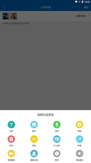 8、可选择的对话类型十分丰富,像文本、图片、语音、表情、红包、转账等都包含在内,能够模拟出真实的聊天对话场景。