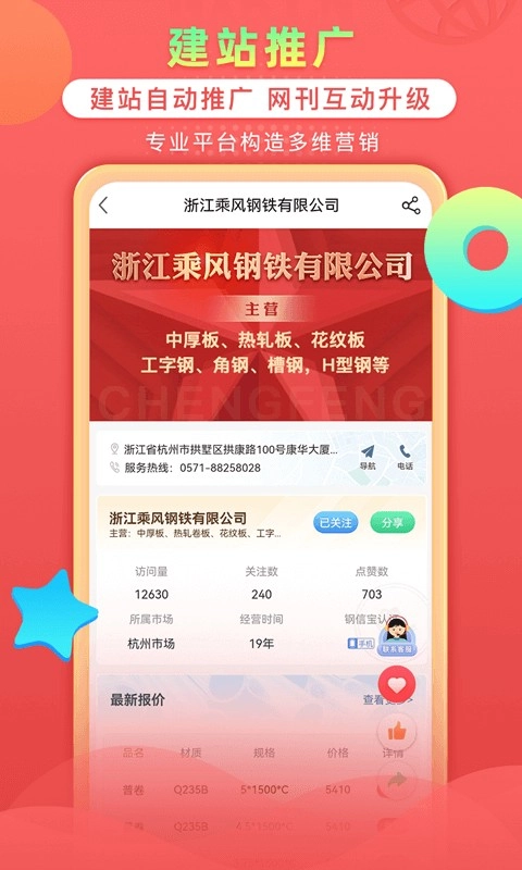 互联网化转型:打造专属移动宣传平台,实现便捷分享与高效传播。借助专业软件,助力钢贸企业快速搭建适配手机、电脑等多终端的专属移动宣传网站。管理端支持资源与信息的快速发布、管理及维护;网页端便于内容的轻松分享与快速传播;移动端同样具备互动信息发布、信息维护及客户资源管理等功能。