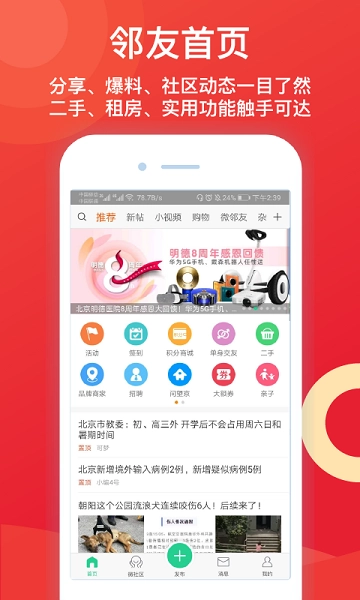 邻友圈App是为社区居民量身打造的社交互动平台,致力于帮助用户构建紧密的邻里关系,提升生活品质。借助这款应用,用户能够便捷地发布、浏览与分享社区动态,参与线上线下活动,结识新伙伴,携手营造和谐美好的社区氛围。凭借丰富的功能、简洁的界面和人性化的设计,邻友圈App赢得了众多用户的青睐与赞誉。