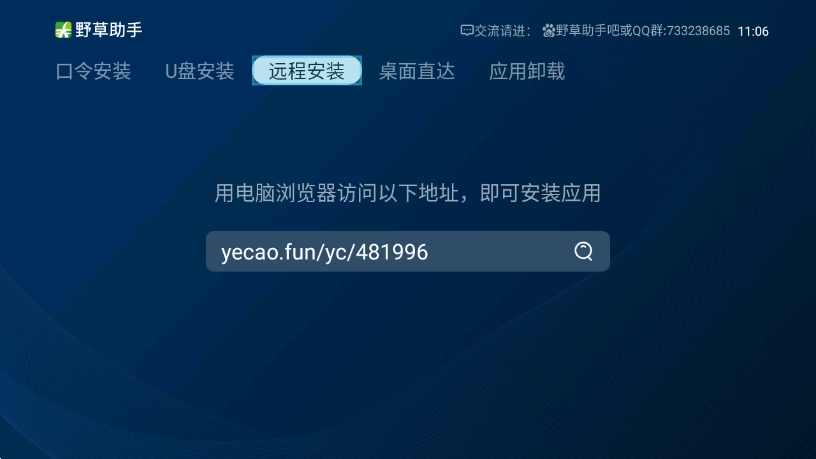 4、系统完全禁止了第三方应用,并且无法开启(长虹、TCL、创维等电视的部分机型存在这个问题)。这种情况下就需要借助U盘,利用系统自身的功能来操作,插入U盘后,野草助手会将你输入口令对应的应用安装到U盘中,之后再自行完成后续步骤。