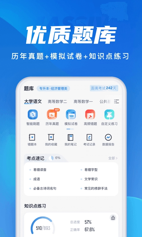成人高考题库包含2265个考点对应的练习内容,提供全国通用卷与地区卷的模拟练习,还设有按固定考试比重随机抽题的真题考场。成绩单会实时记录考试数据,通过点滴反馈考生近期的学习状态及正确率提升情况,能有效增强考生通过考试的信心。