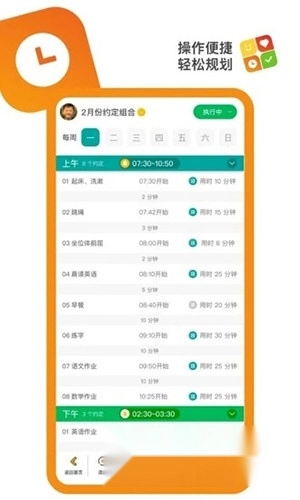 ✧完成约定科目创建后,家长能够便捷地把孩子的成长科目分配到一周内每一天的上午、下午和晚上。