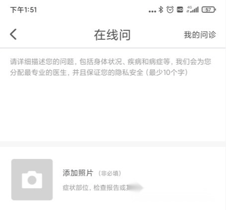 进入首页后,点击在线提问功能,输入你要咨询的问题,之后还能添加一张照片。