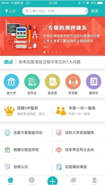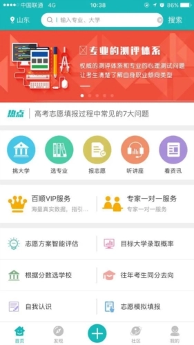 权威测评体系:应用配备权威的测评体系,可检测每位用户当下的能力水平与心理特征,为用户提供科学的志愿填报建议。