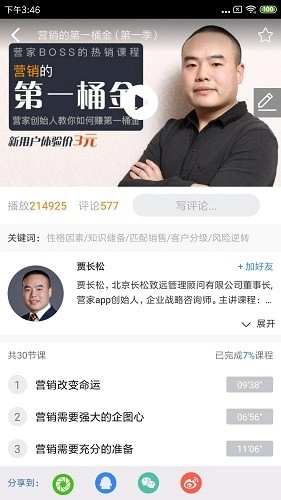 营家作为长松咨询的全资子公司,由贾长松先生创立,其核心团队成员均来自百度、凤凰、阿里等知名互联网企业。该平台致力于为中国8000万以上的销售人员打造互联网在线培训商学院,让学习更具自主性与灵活性。它是企业值得信赖的教育培训伙伴,移动教学内容每周更新,助力用户更快掌握营销管理技巧。通过销售场景与知识体系相结合的方式,帮助用户充分利用碎片化时间进行学习。