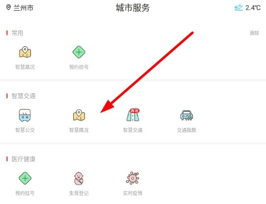 1、进入城市服务界面后,在该界面点击“智慧路况”选项。
