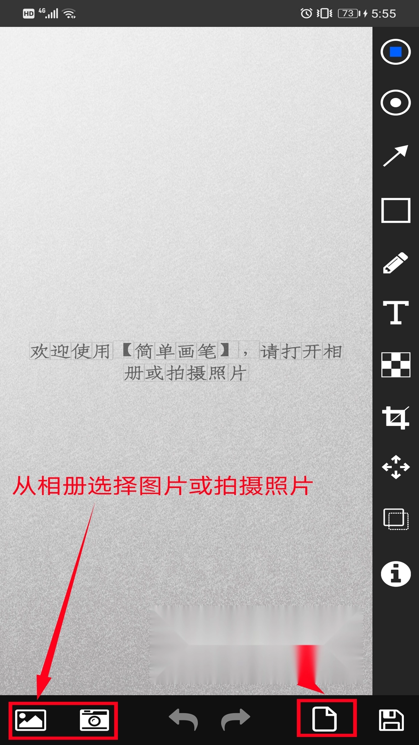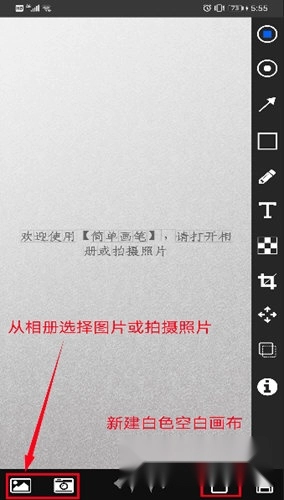 首先启动简易绘图工具,你既可以从相册里挑选一张照片来做标注,也能拍摄一张照片并利用它进行标注,另外还可以创建一张新的空白画布,在上面自由绘制图形。