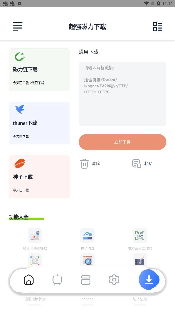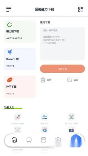 打开软件首页,能看到磁力、thuner、种子、http、FTP等选项,另外还有磁力转二维码、本地种子扫描、种子清晰等工具。