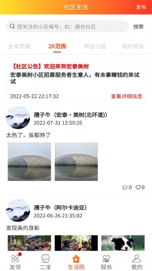用户可以发布社区动态,关注友邻发布的社区动态。
