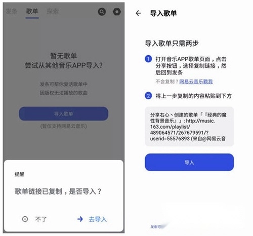3、提到歌单,导入外部歌单完全可行,尽管目前仅支持网易云音乐,但使用体验相当不错,用户只需完成复制操作,后续的事情就由发条来处理了。