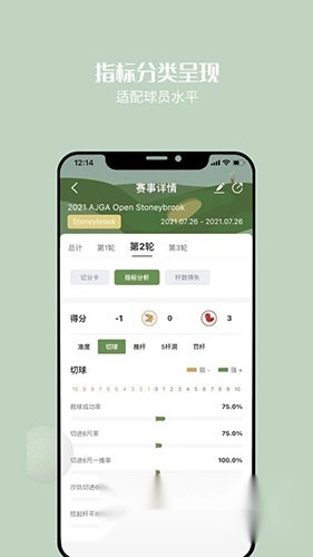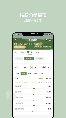 2、国际标准计分卡,从开球、攻果岭、救球到推杆,各项技术表现分类清晰呈现