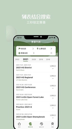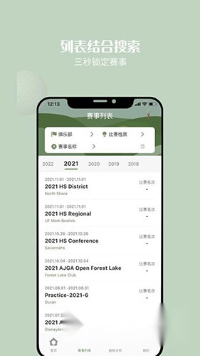 洞见18是一款专为高尔夫运动打造的优质运动数据分析软件。它支持结合列表搜索各大俱乐部旗下高尔夫运动员的比赛记录,并且提供多种分类搜索方式,比如按时间顺序、比赛名称、比赛性质等,帮助用户全面深入地了解相关数据。