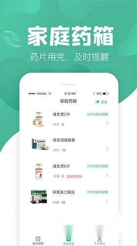 2、配备家庭药箱,添加药品及数量后就能保存,选中药品可设置提醒或查看库存情况;