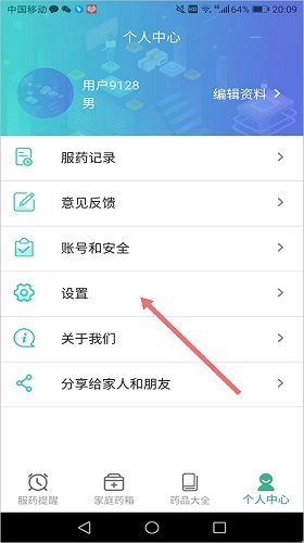 1、打开“吃药啦”应用并完成登录,接着点击底部导航栏里的【个人中心】,进入新页面后再点击【设置】选项。