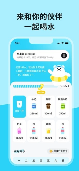 ·日历查看记录:以直观的日历形式呈现您的喝水记录,方便您随时查看和分析自己的喝水情况。