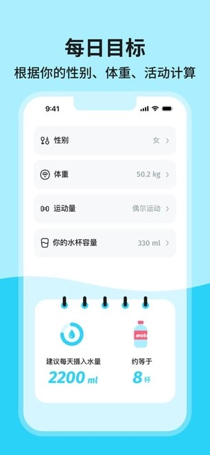 ·个性化饮水目标:依据您的身体数据,为您定制科学的饮水目标,助力您养成良好的饮水习惯。