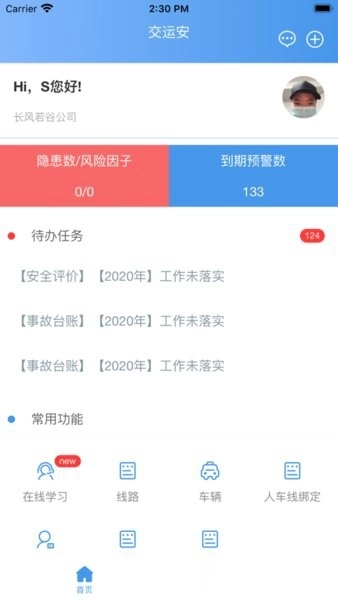 这是一个交通运输企业安全管理服务平台,代办任务里每天的工作进展都清晰可见,能实现跨区域调度,保障每台车辆安全运行,还能自动识别不安全因素并及时处理。