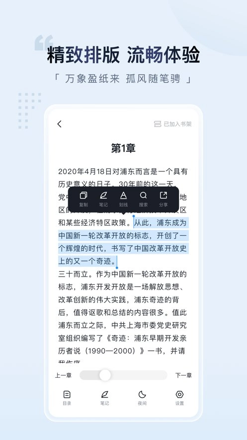 【精致个性化阅读体验】采用简洁设计与精良排版,EPUB精排版资源带来优质阅读感受。阅读时可添加划线、批注与书签,还能自由定制主题风格、阅读排版、背景及翻页方式,打造专属于你的阅读风格。