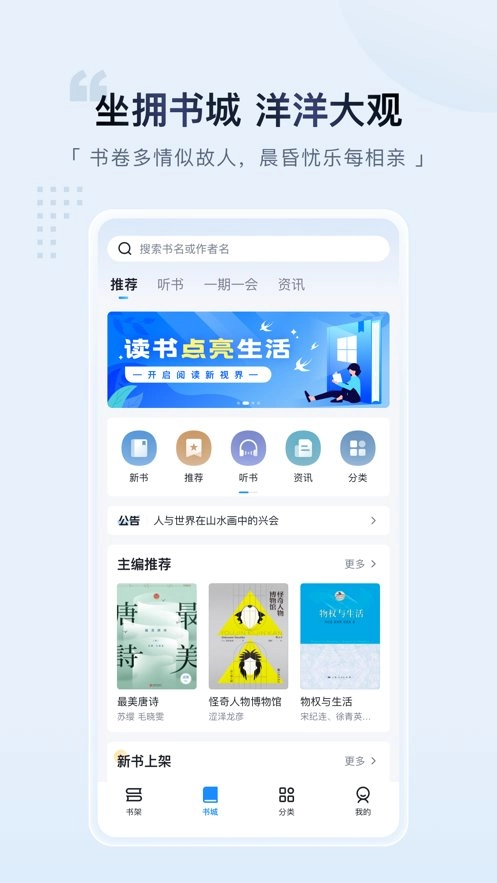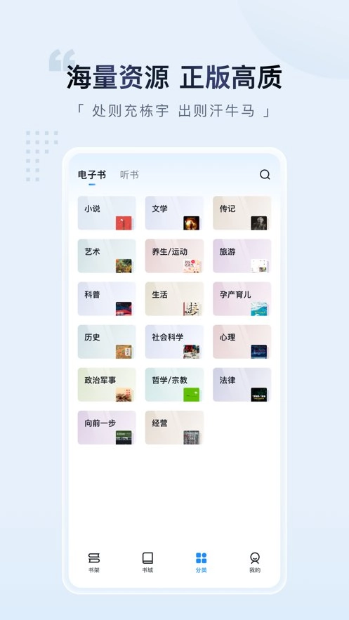 【海量高品质资源】涵盖小说、文学、励志、经管、社科、历史、生活、童书、教育、科技、艺术和外文原版书等各大品类及党政、军队、农家书屋、企业经管等各行业特色资源数十万种,均为知名出版社资源。