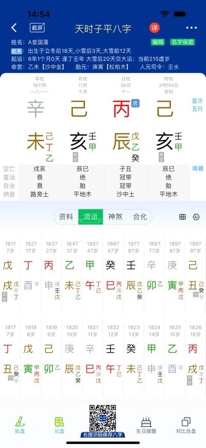 13、创新推出大运前详细批盘功能:能够对每一大运和流年进行详尽批断,且数据永久云端存储;支持将多人测算的八字记录关联至同一八字条目下,方便开展对比与复盘工作。