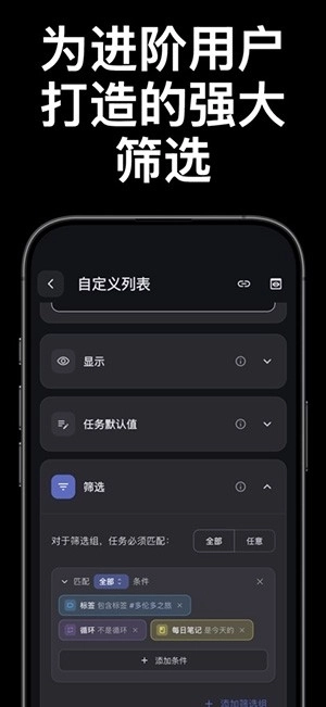 6、自定义筛选列表:借助高级条件生成任务视图,可依据标签、项目、上下文、日期、优先级等维度进行筛选。