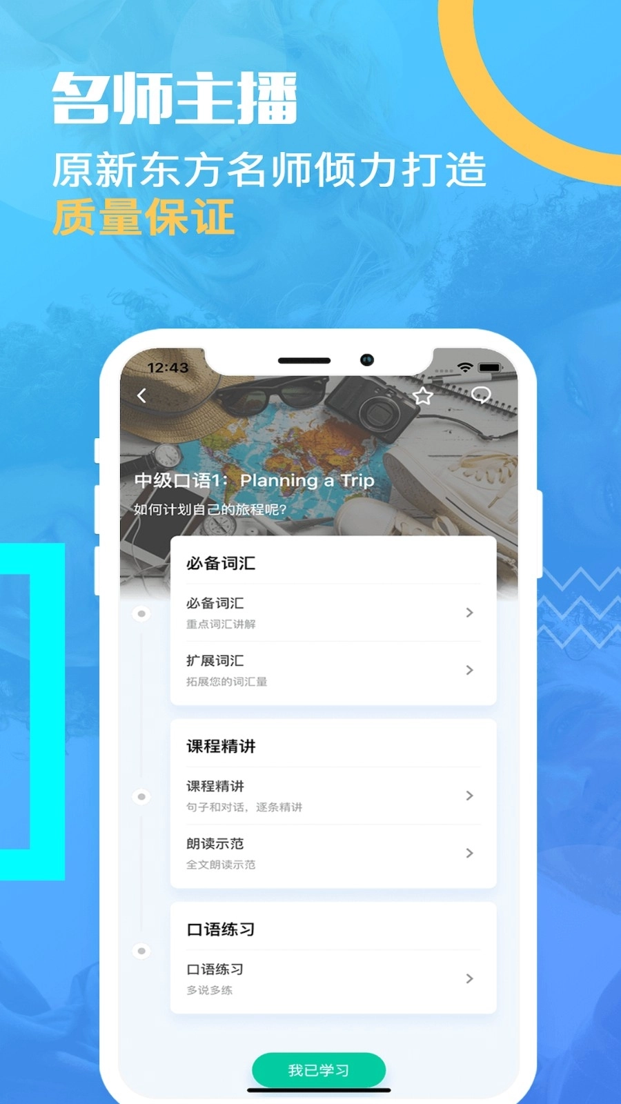 1、用户可在此随时进行英语学习,其中包含口语教学、听力训练等优质课程。