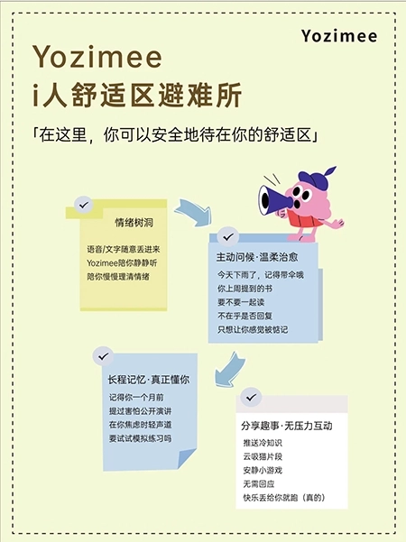 4、yozimee使AI从被动回应的工具转变为主动牵挂的陪伴者。